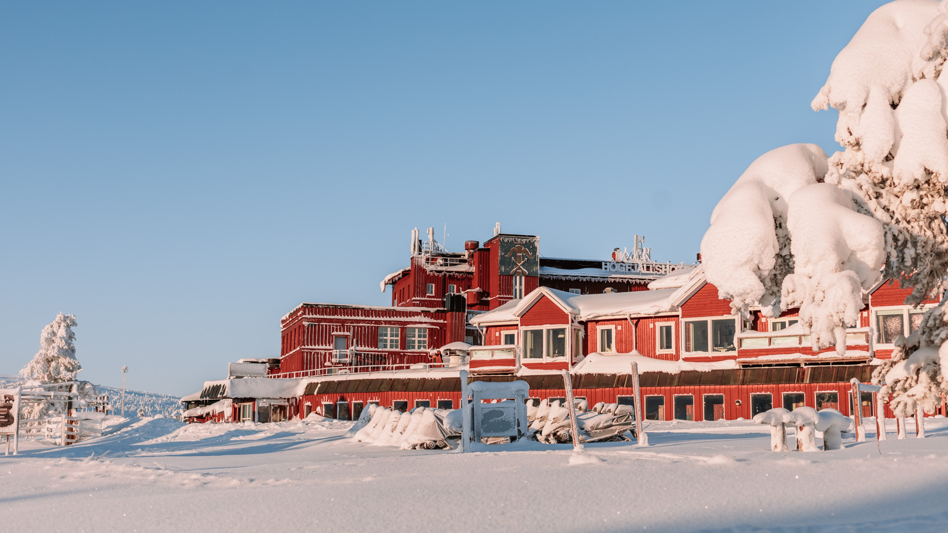 Rød bygning i snedækket landskab med blå himmel i baggrunden, omgivet af sneklædte træer