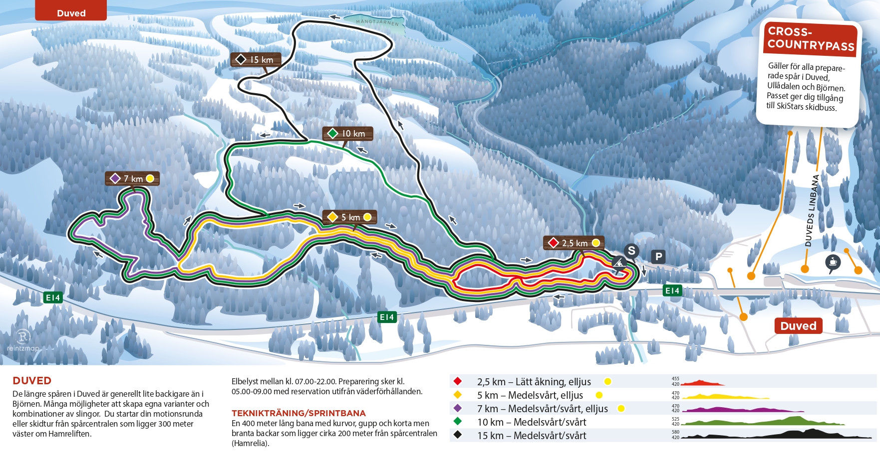 Til vinteren vil du kunne nyte langrennkjøring i våre nye SkiStar Cross-Country Arenaer, som vil finnes i Duved og Björnen. Her finnes begge løyper for deg som elsker å kjøre klassisk eller skøyte. Det finnes opplyste løyper på utvalgte strekninger og tilgang til smørebod, varmestue og toaletter.