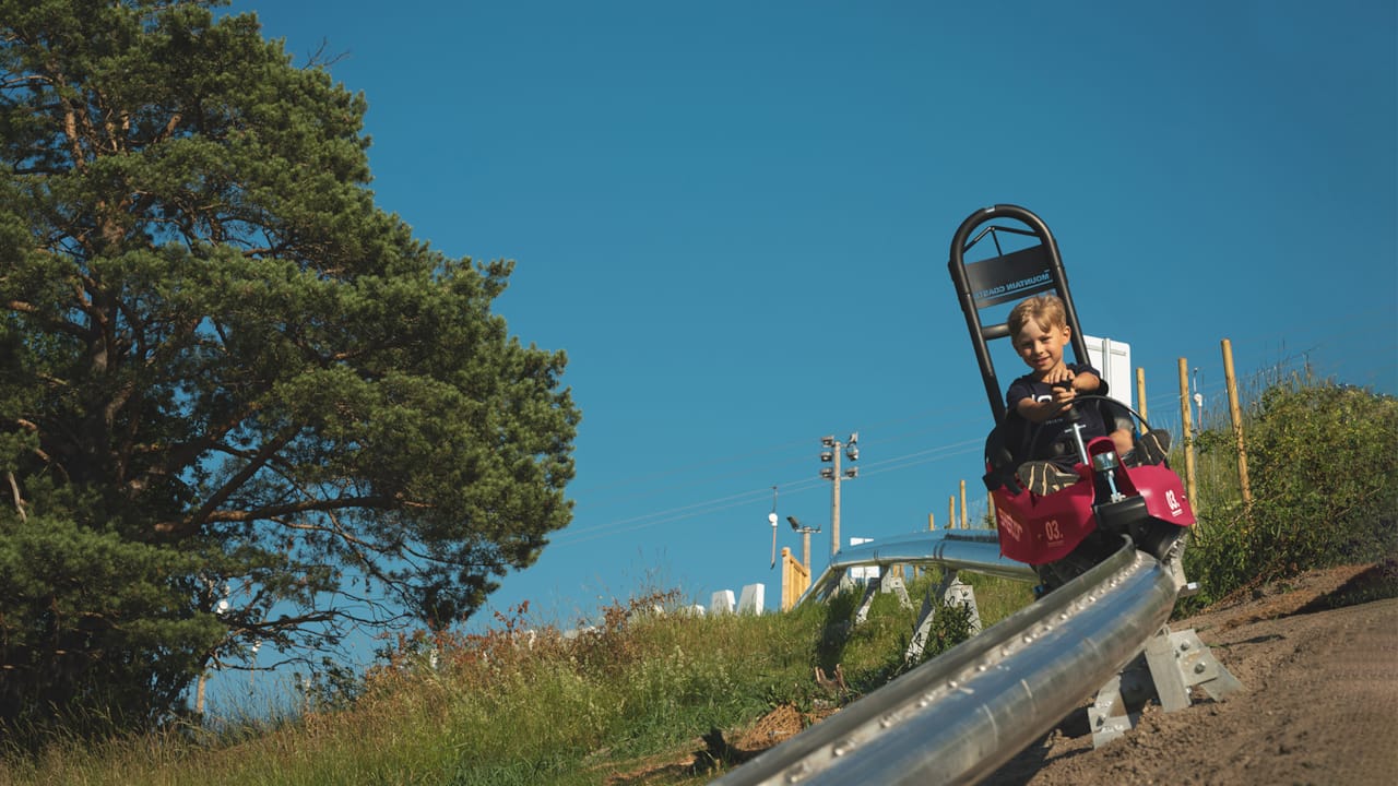 Mountain Coaster bjuder på rodel för hela familjen. Liften drar dig och din rodel uppför och sedan är det full fart nerför.